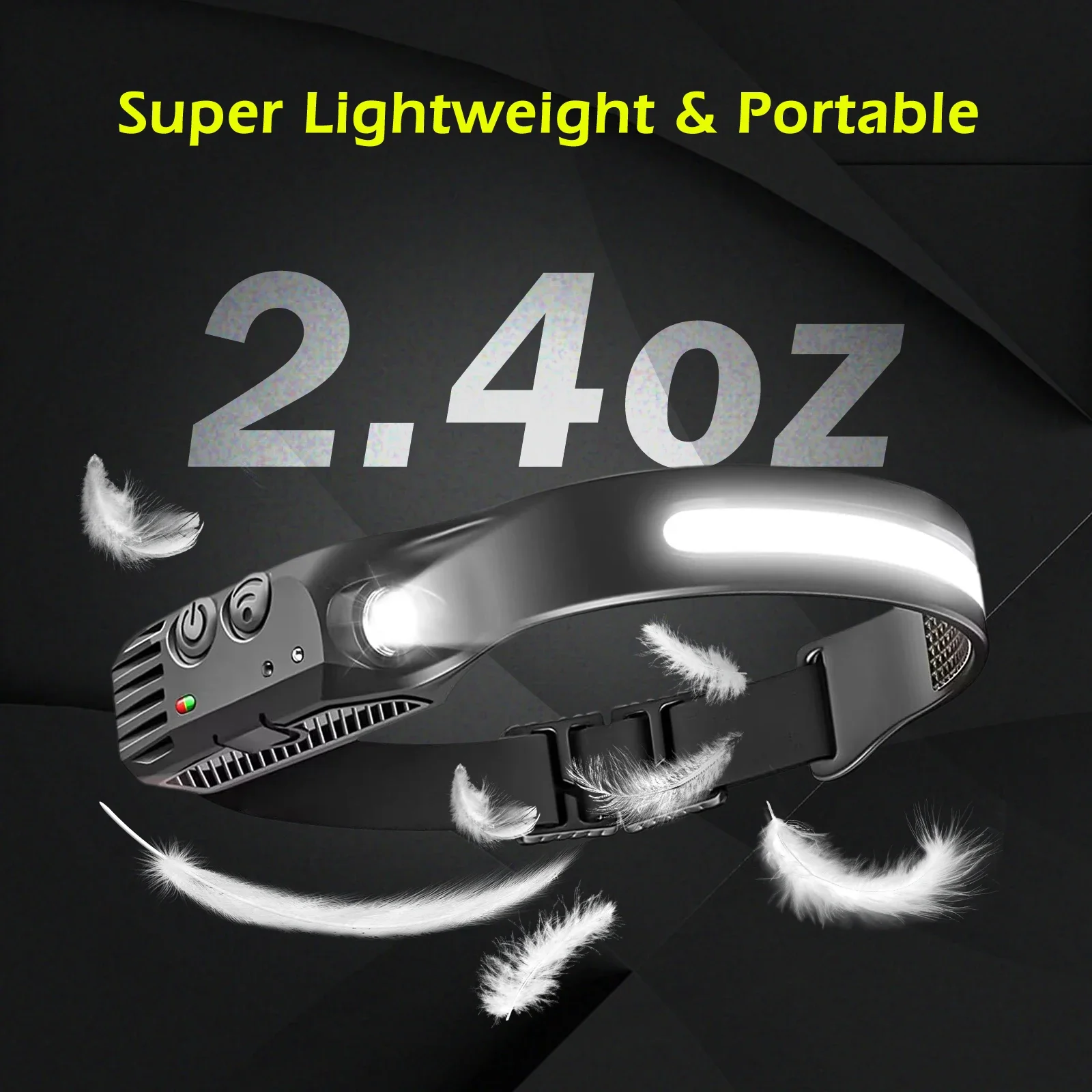 【LIGHTWEIGHT & COMFORTABLE】 - The Rechargeable headlamp is composed of soft silicone and an adjustable elastic headband, suitable for adults or children. The product weighs only 2.4oz. Small size design can be folded and easily put into the pocket.