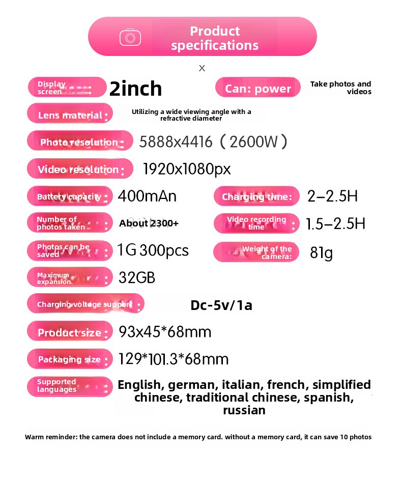 Functions: Photography, video recording, filters, timer, continuous shooting, selfie mode