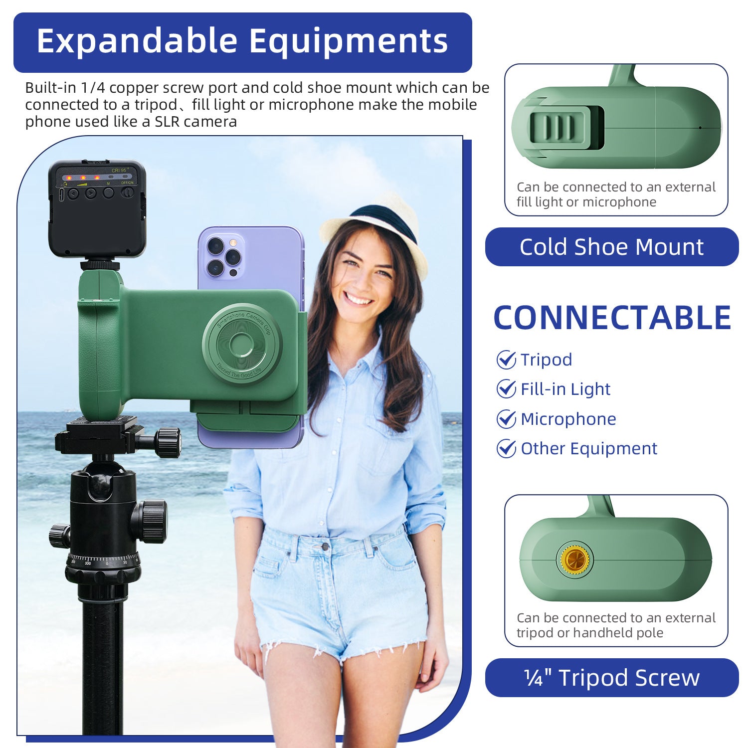 Conception extensible – Écrou en cuivre 1/4" intégré et support de griffe flash pour trépieds/éclairages
